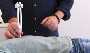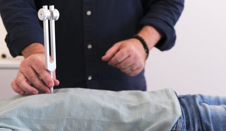 Diapasons thérapeutiques : instruments acoustiques en métal, calibrés pour vibrer à une fréquence précise, les diapasons sont utilisés en sonothérapie pour transmettre des vibrations au corps ou dans le champ énergétique de la personne. La plupart des diapasons que j'utilise en séance sont lestés d'un poids. Cela augmente leurs vibrations mais ils émettent peu de son.